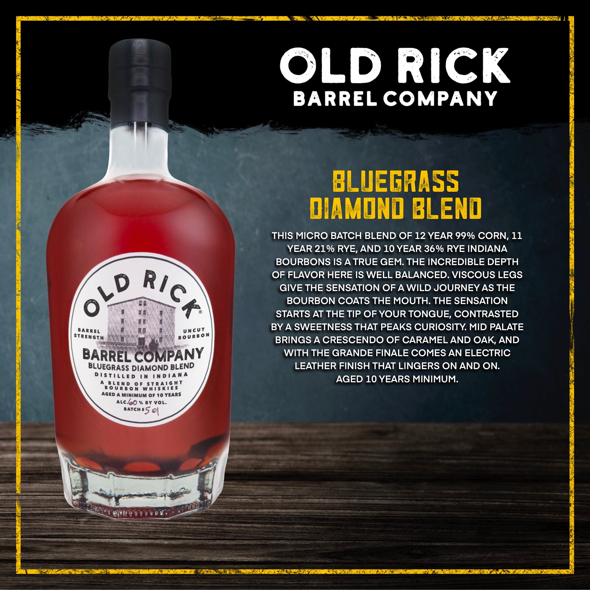 Old Rick Bluegrass Diamond Blend at 112 proof unites two decade‑aged bourbons with a decade‑aged light whiskey for a truly refined expression—sweet, floral, and crowned by a luscious honey finish.
