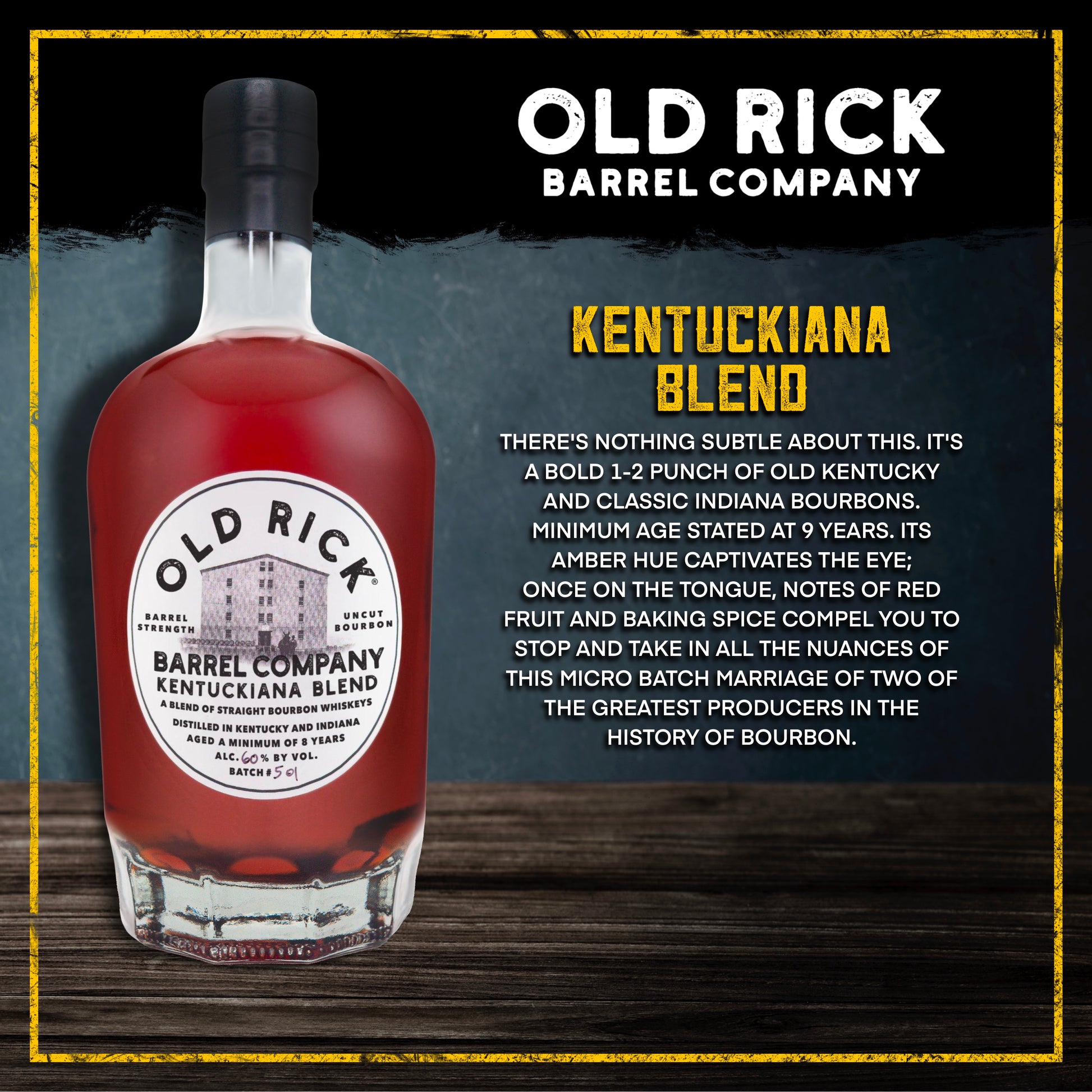 Old Rick Kentuckiana Blend at 122 proof marries nine‑year‑old MGP and Barton bourbons for a truly premium expression, transitioning from elegant floral aromas to a robust, full‑bodied palate, and finishing with an enduring, satisfying warmth.